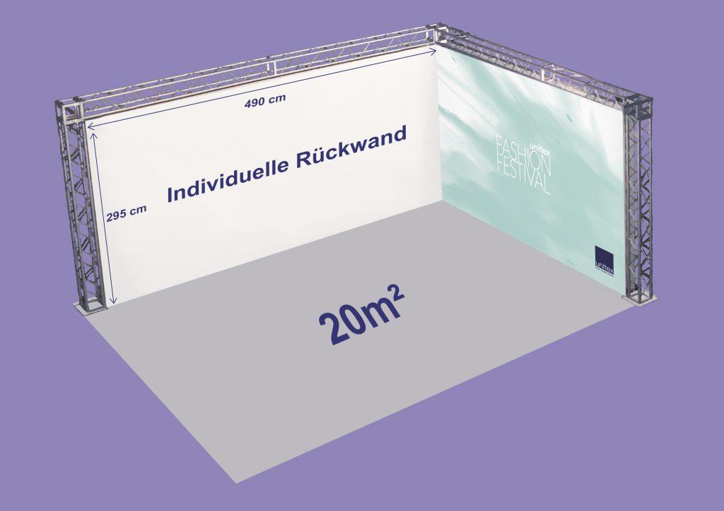 In Ihrem Paket ist eine individuelle Rückwand enthalten, die Sie individuell gestalten können. Optional kann zusätzlich eine Seitenwand nach Ihren Wünschen gestaltet werden. Ohne Zusatzbuchung wird die Seitenwand mit dem uFF26-Logo und der Farbwolke gebrandet. Farbe und Design werden dabei an die Rückwand angepasst.