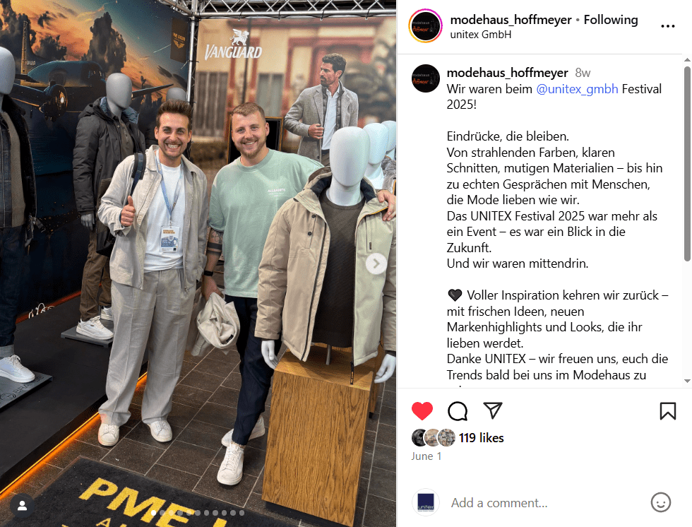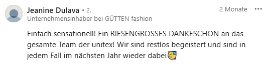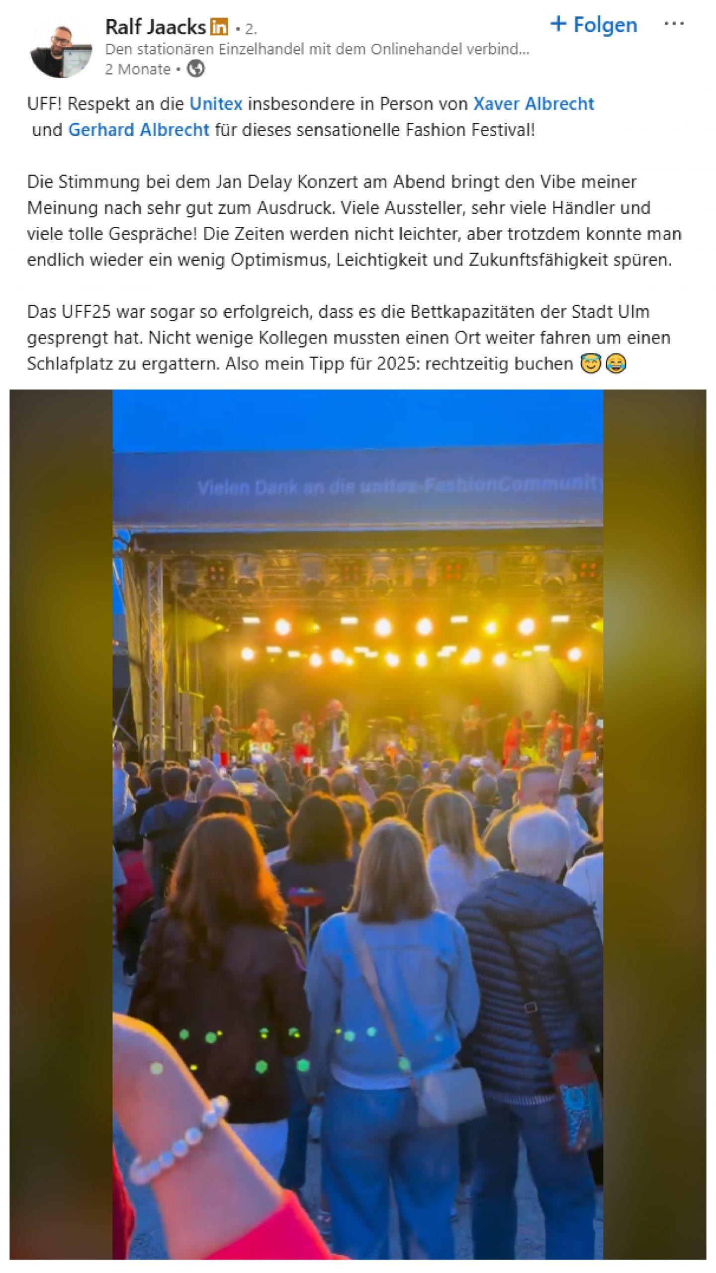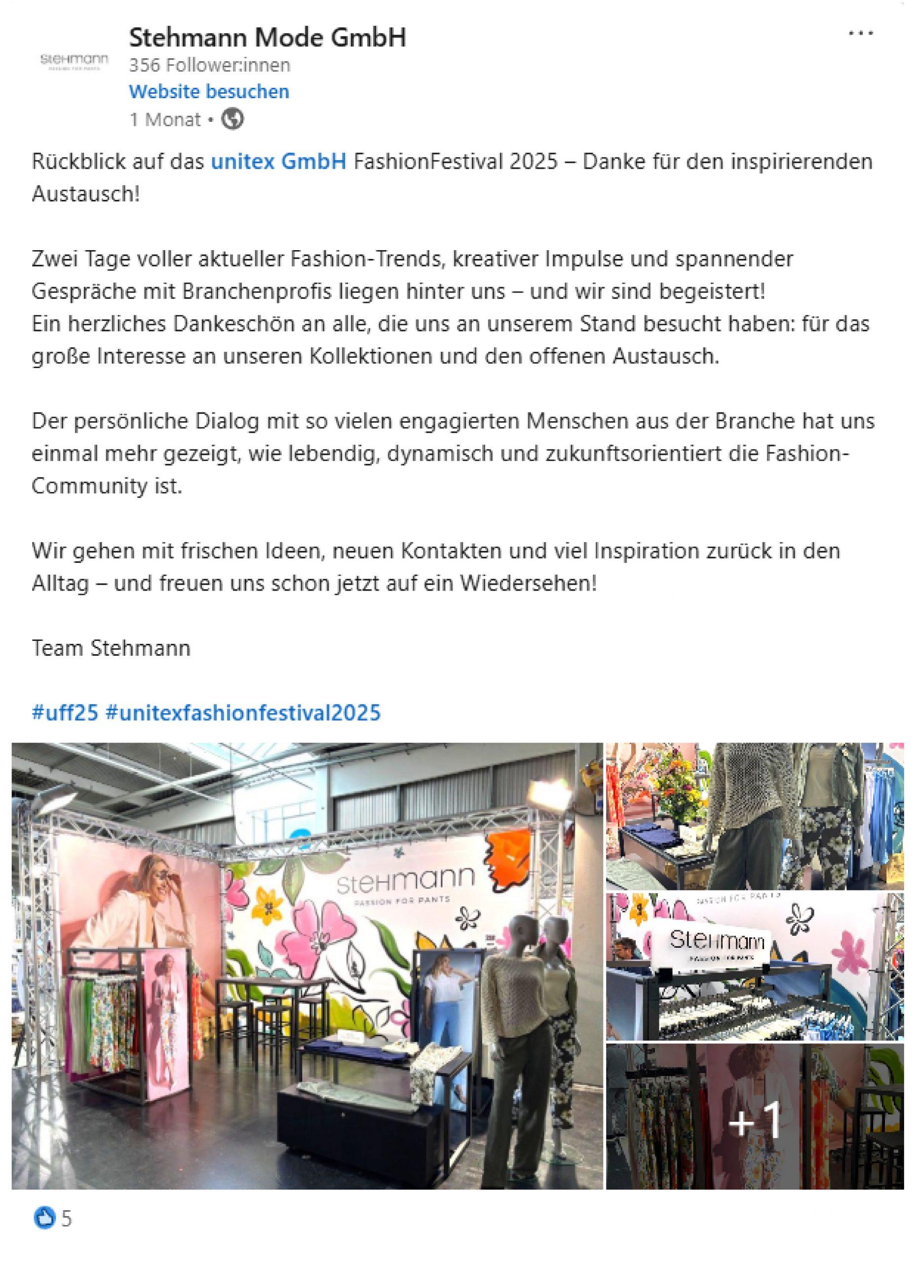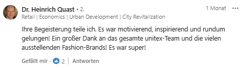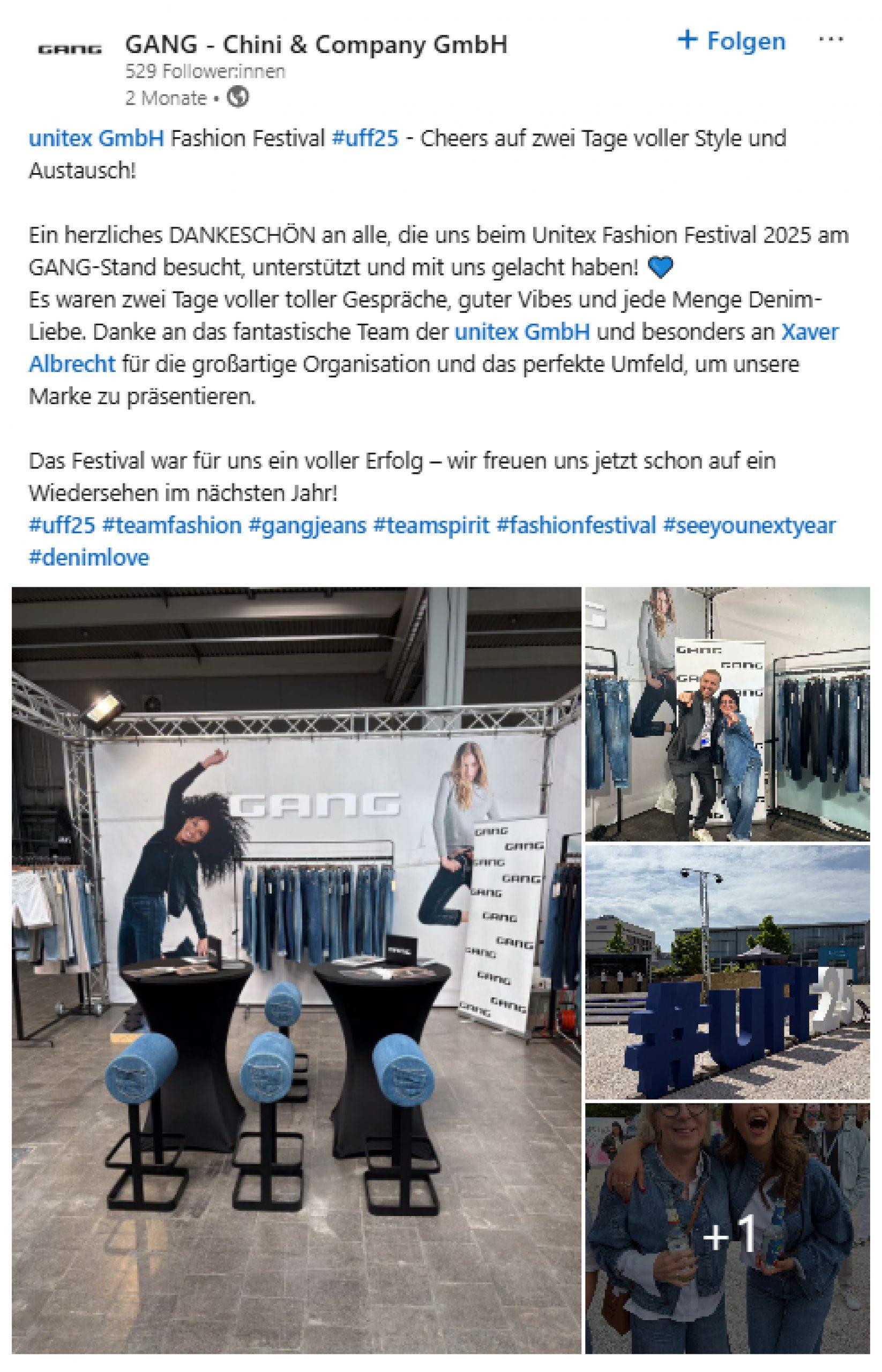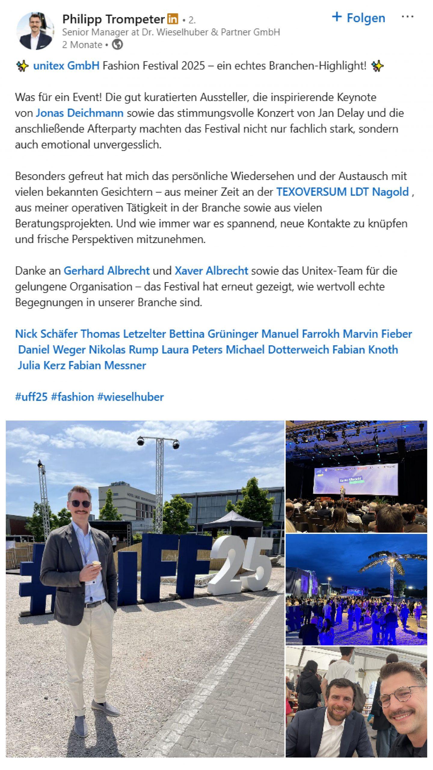 Das unitex-FashionFestival ist kein Orderevent – und das mit voller Absicht. Wir setzen bewusst auf einen Termin im Mai, fern der klassischen Orderzyklen. So entsteht Raum für echtes Networking, strategischen Austausch und die Auseinandersetzung mit Zukunftsthemen – ohne Zeitdruck, mit offenem Blick.