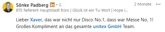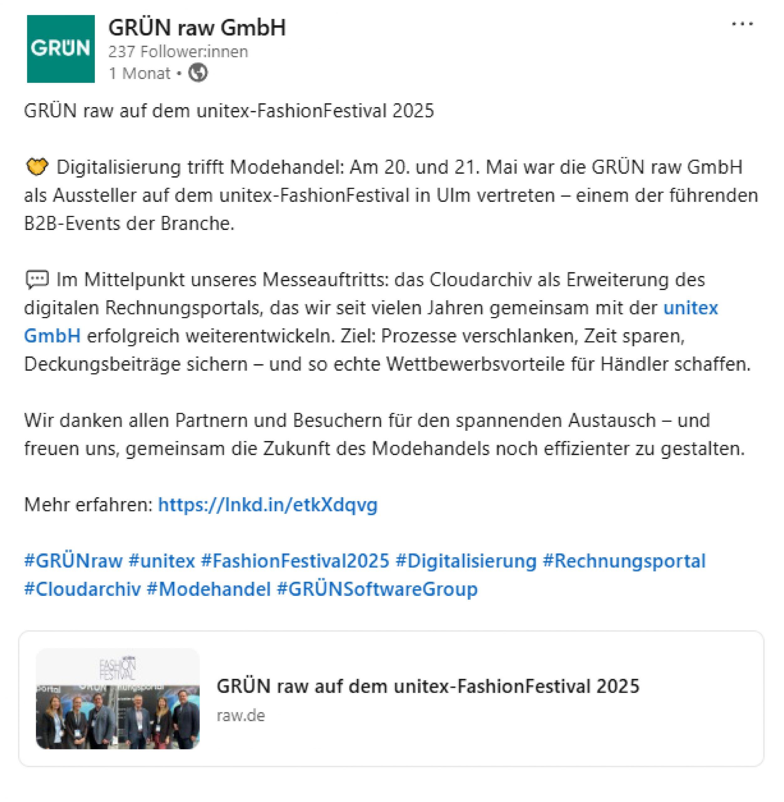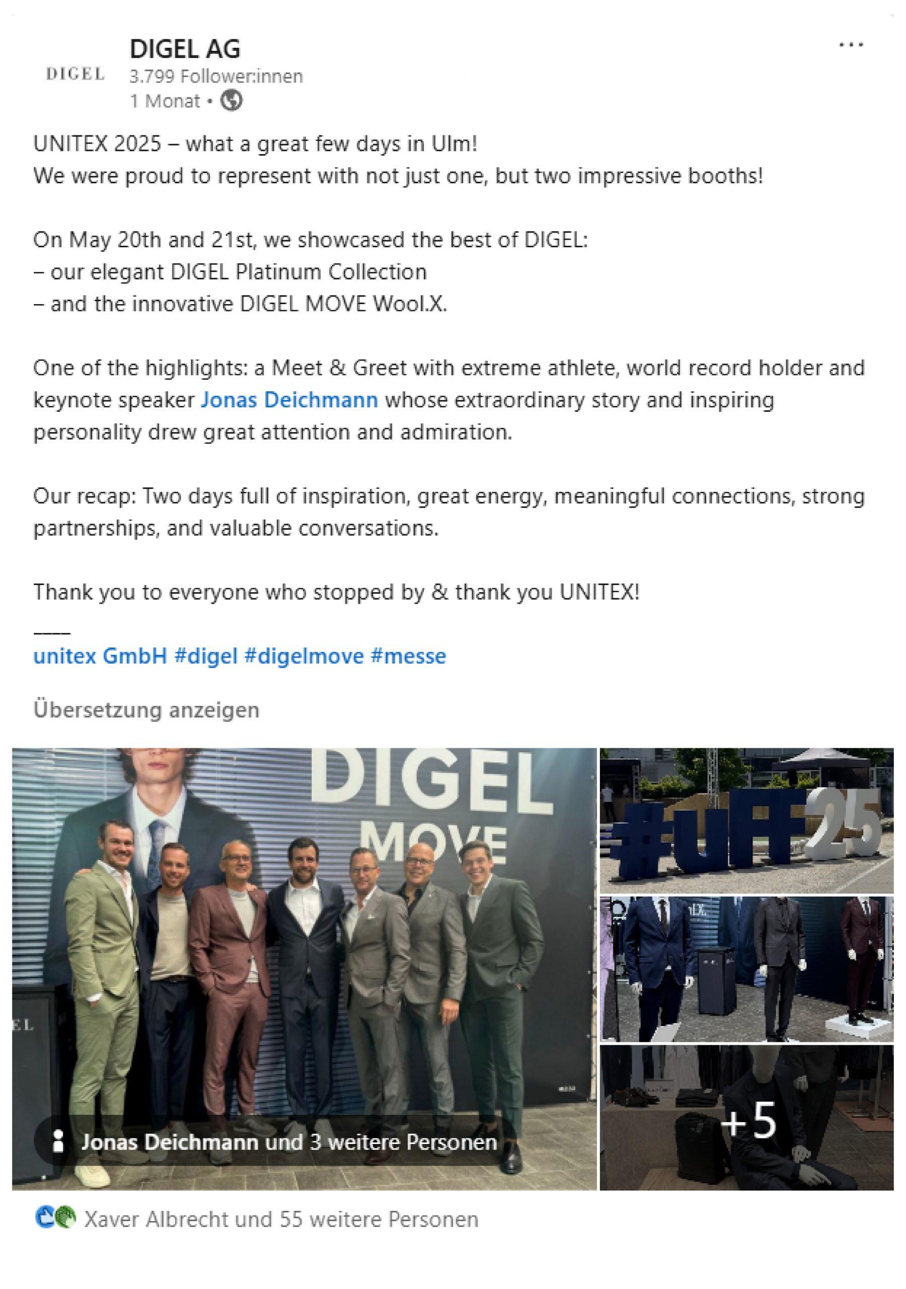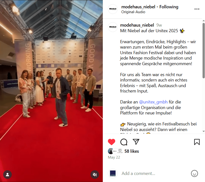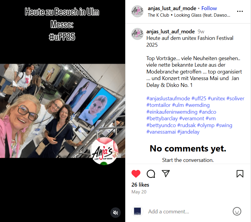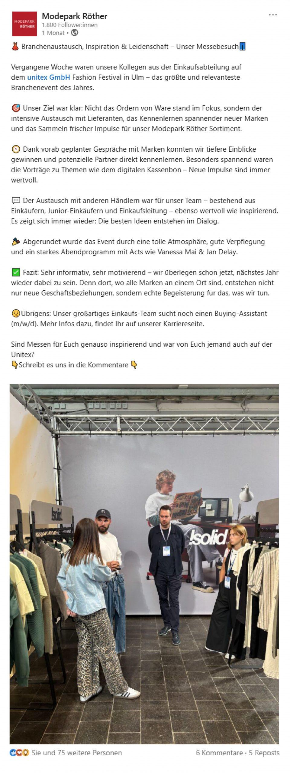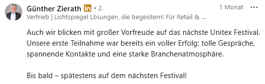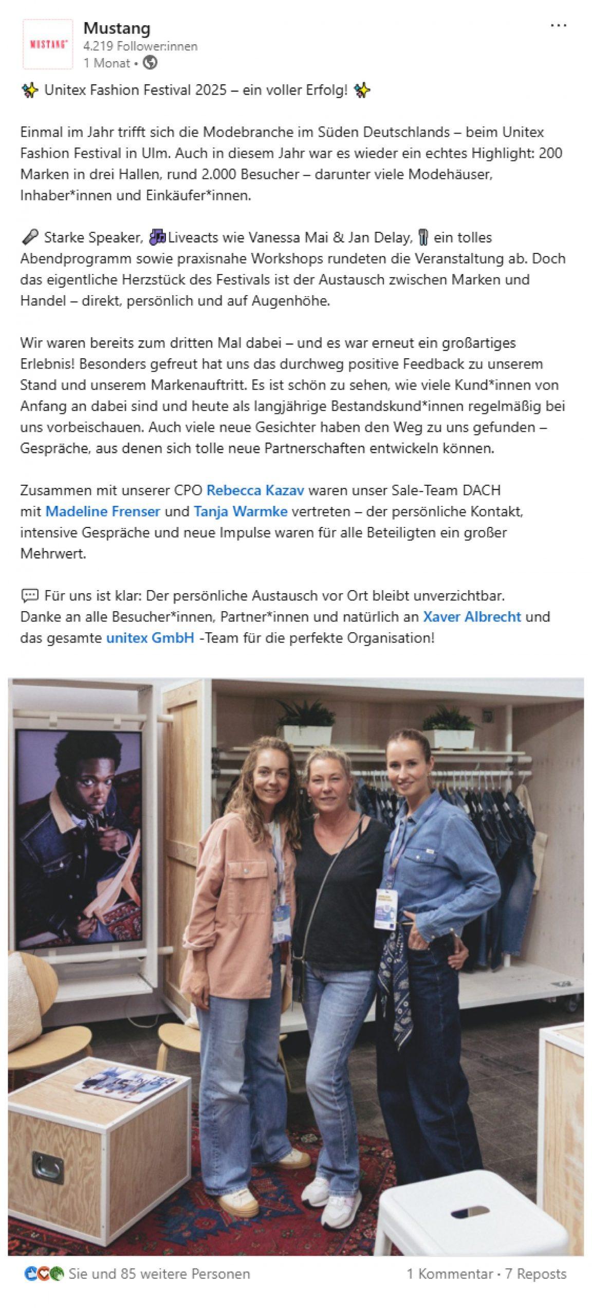 Das unitex-FashionFestival ist kein Orderevent – und das mit voller Absicht. Wir setzen bewusst auf einen Termin im Mai, fern der klassischen Orderzyklen. So entsteht Raum für echtes Networking, strategischen Austausch und die Auseinandersetzung mit Zukunftsthemen – ohne Zeitdruck, mit offenem Blick.